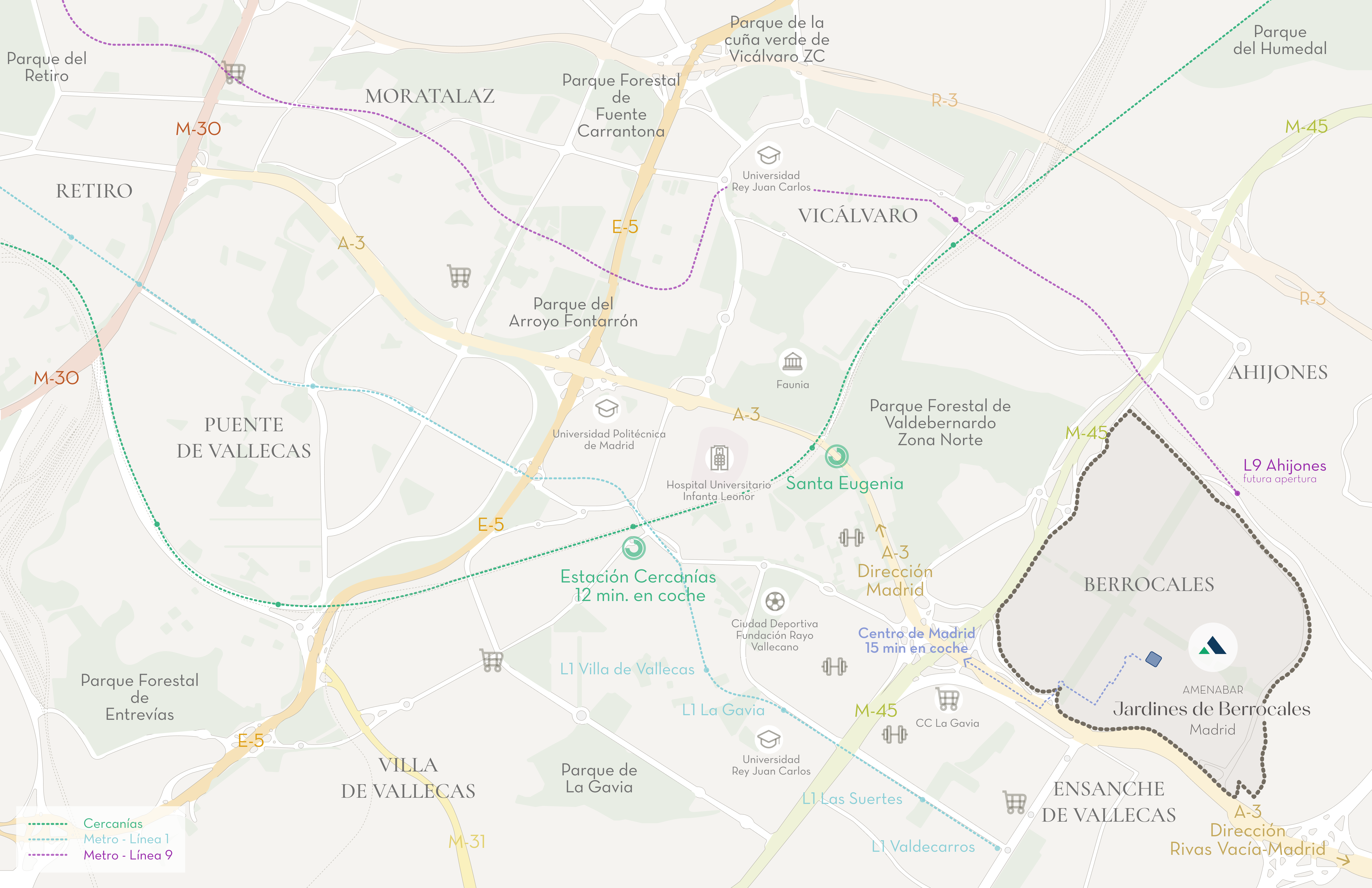 Cuenta con excelentes conexiones, a solo 15mins del centro de Madrid, gracias a su proximidad con las vías M45 y A3. Dispone de carril Bus Rapid y se encuentra a 10 minutos de la estación de cercanías Santa Eugenia y de la L1 de Metro, desde las estaciones Las Suertes y Valdecarros.